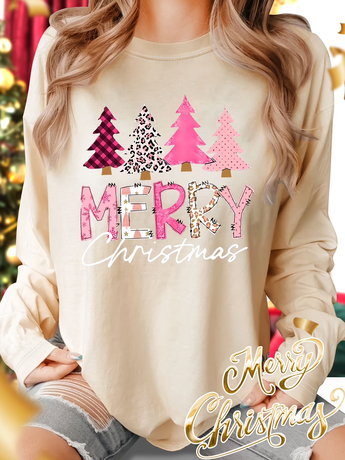 Christmas Autumn and Winter Outfits Pink Christmas Tree Letter Print Round Neck Casual Sporty Fresh Elegant Plus Size Women'S T-Shirt Autumn and Winter Long Sleeve Fashion Commute Vacation Daily Versatile Retro Style Top Multiple Colors Available 1XL-5XL