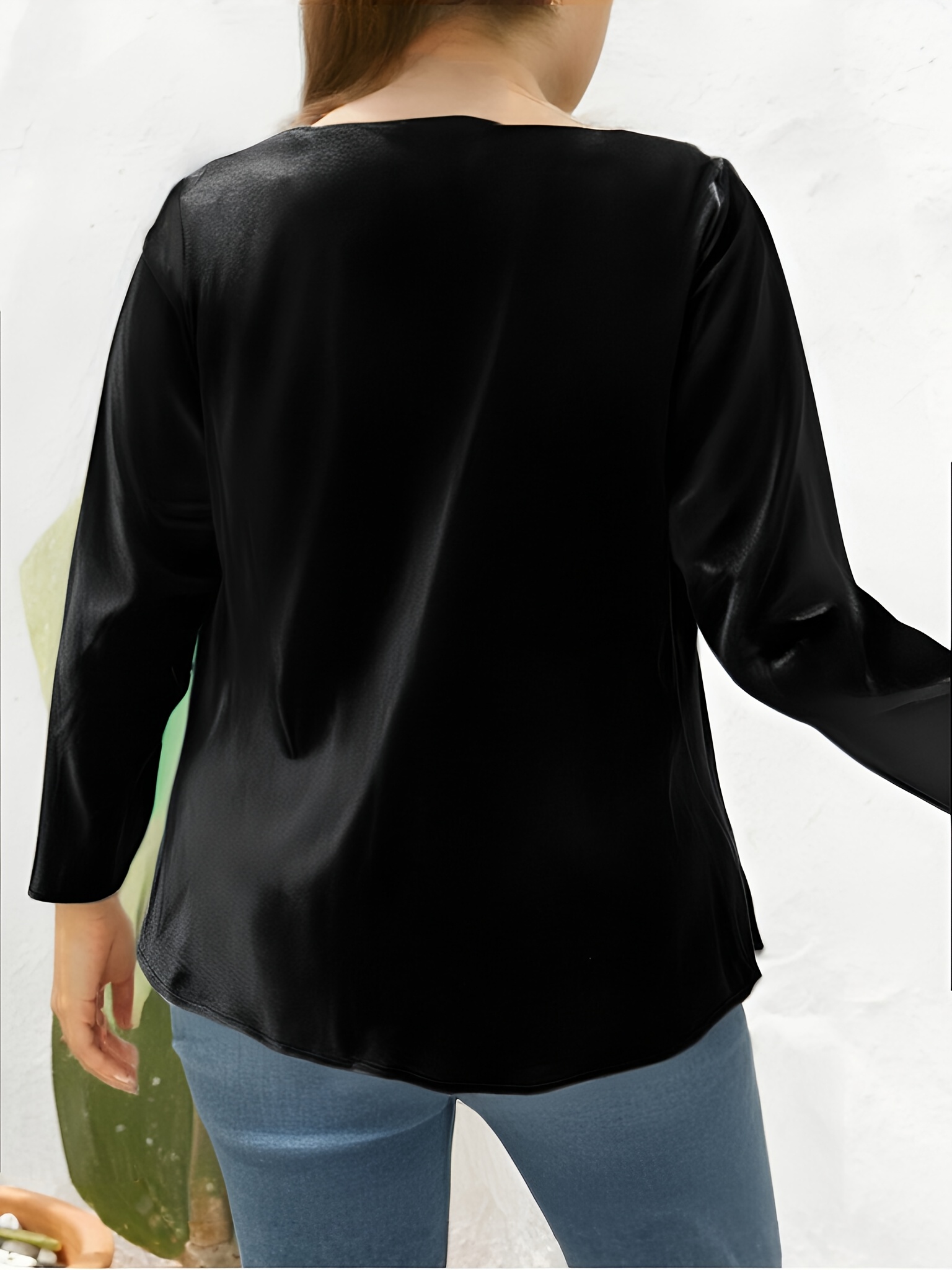 Plus Size - Elegant Plus Size Satin Blouse for Women - Long Sleeve, Off-Shoulder Design, Solid Black, Smooth Polyester Fabric, Perfect for Spring & Fall, Stylish Office Attire, Versatile Blouse | Offshoulder Top | Glossy Texture