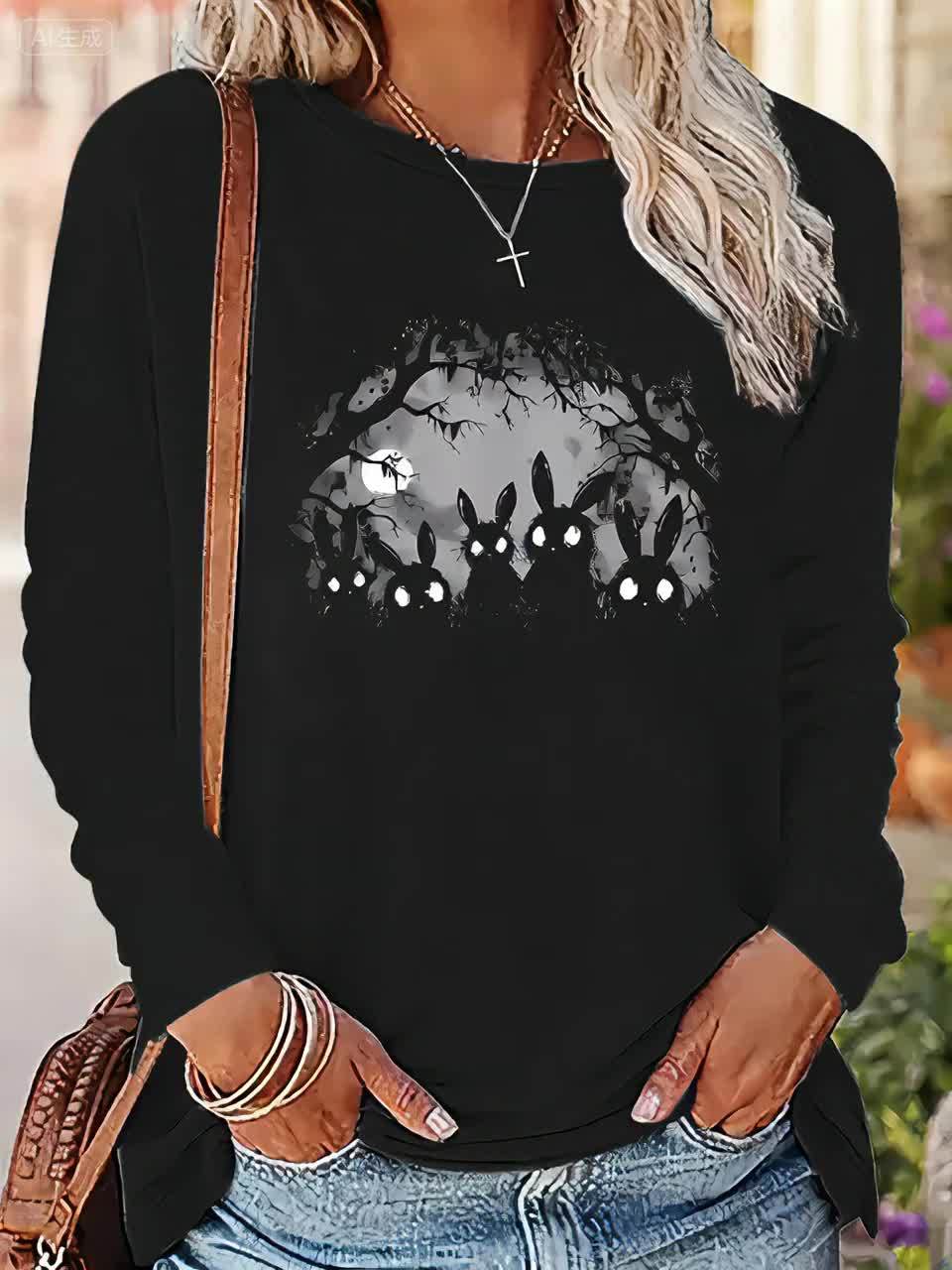[Plus Size Halloween T-Shirt] Plus Size Women's Halloween Oversized Long Sleeve T-Shirt | Gothic Rabbit Print with Spooky Forest | Black & White Halloween Party Outfit | Casual Everyday Fall/Winter Top | Machine Washable Year-Round Layering Essential