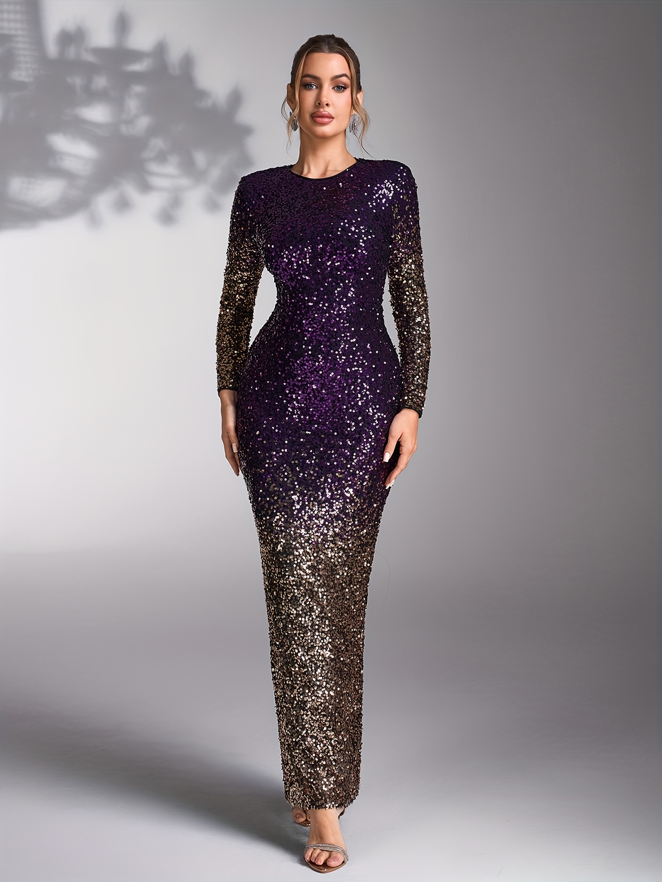 Elegant Purple Sequin Gradient Bridesmaid Evening Gown - Long Sleeve, Round Neck, Form-Fitting Maxi Dress for Weddings and Formal Events, Bridesmaid Dress, Wedding Attire, Sophisticated Style, Detailed Sequins, Medium Elasticity