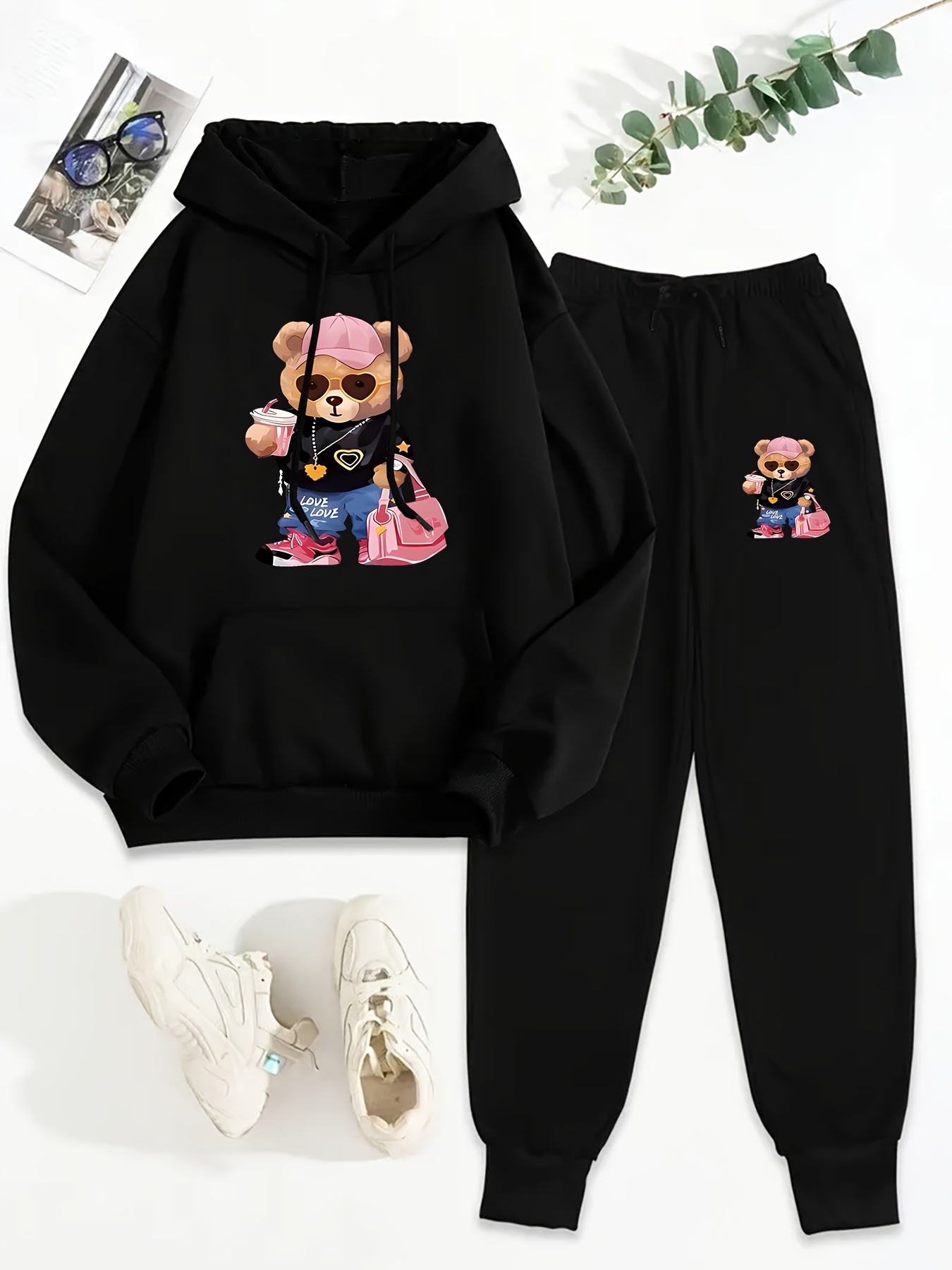 Cozy Fleece-Lined Women's Hoodie & Jogger Set - Cute Bear Print, Drawstring, Long Sleeves - Casual Fall/Winter Ensemble in Black