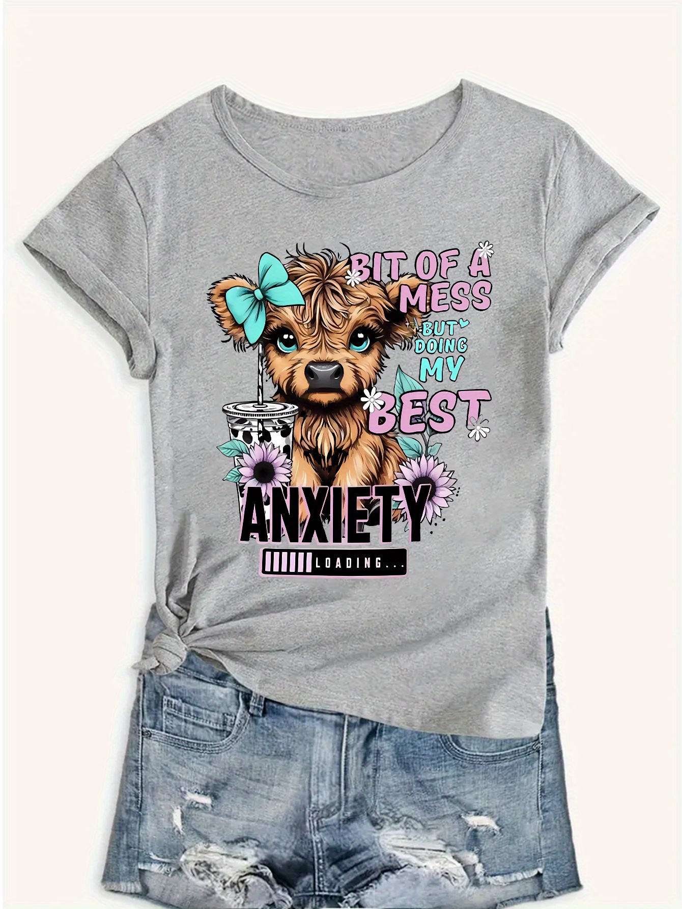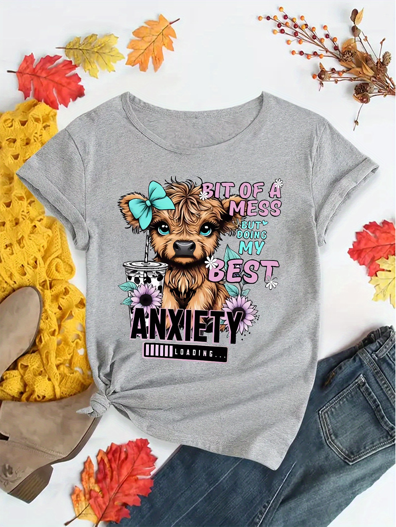 Women's Cute Cartoon Cow Print T-Shirt, Round Neck Short Sleeve Fashion Sports Tee, Comfortable Casual Top, Knitted Polyester Fabric, Romantic Style, All Seasons, Ladies Leisure Sportswear