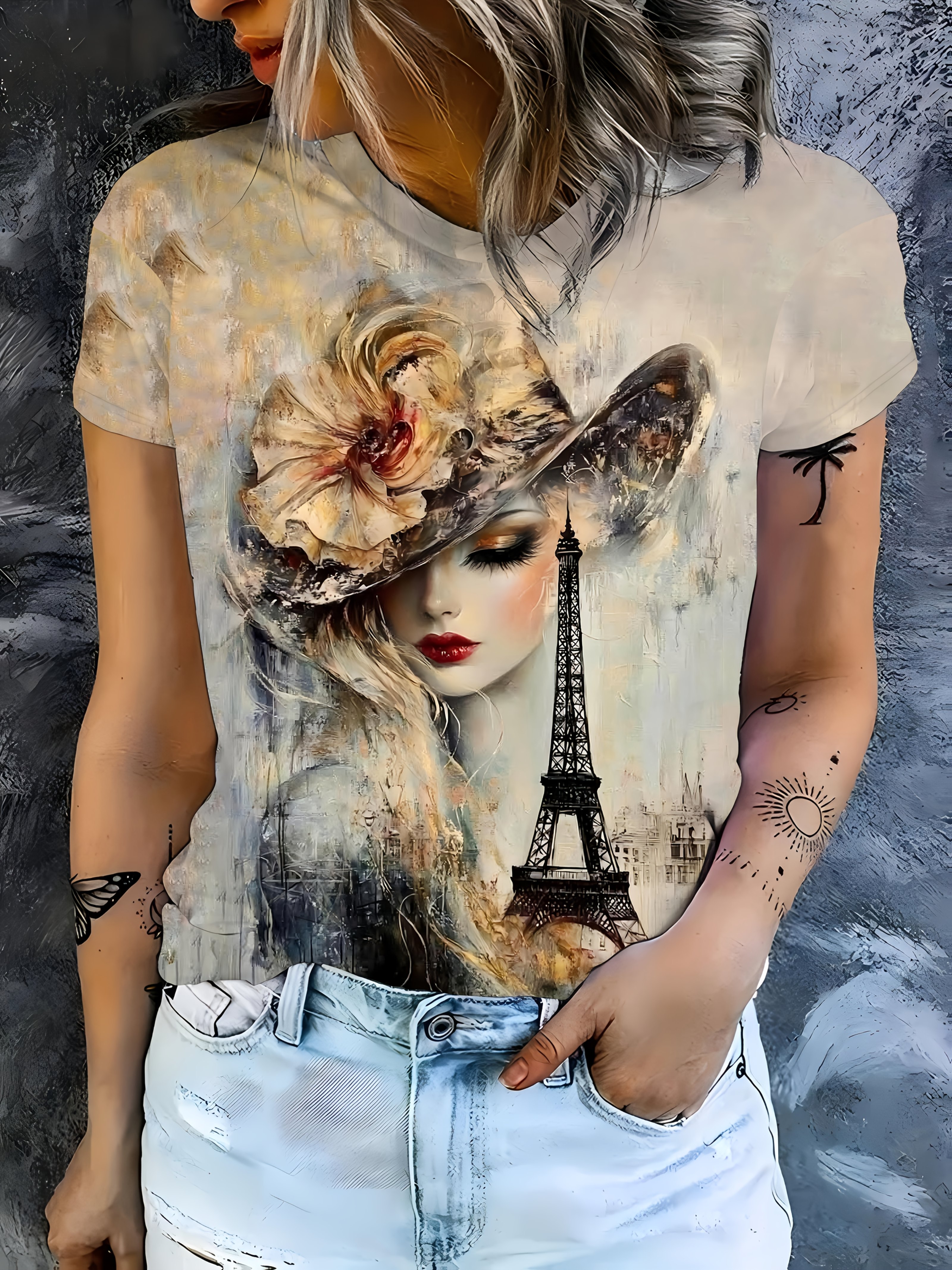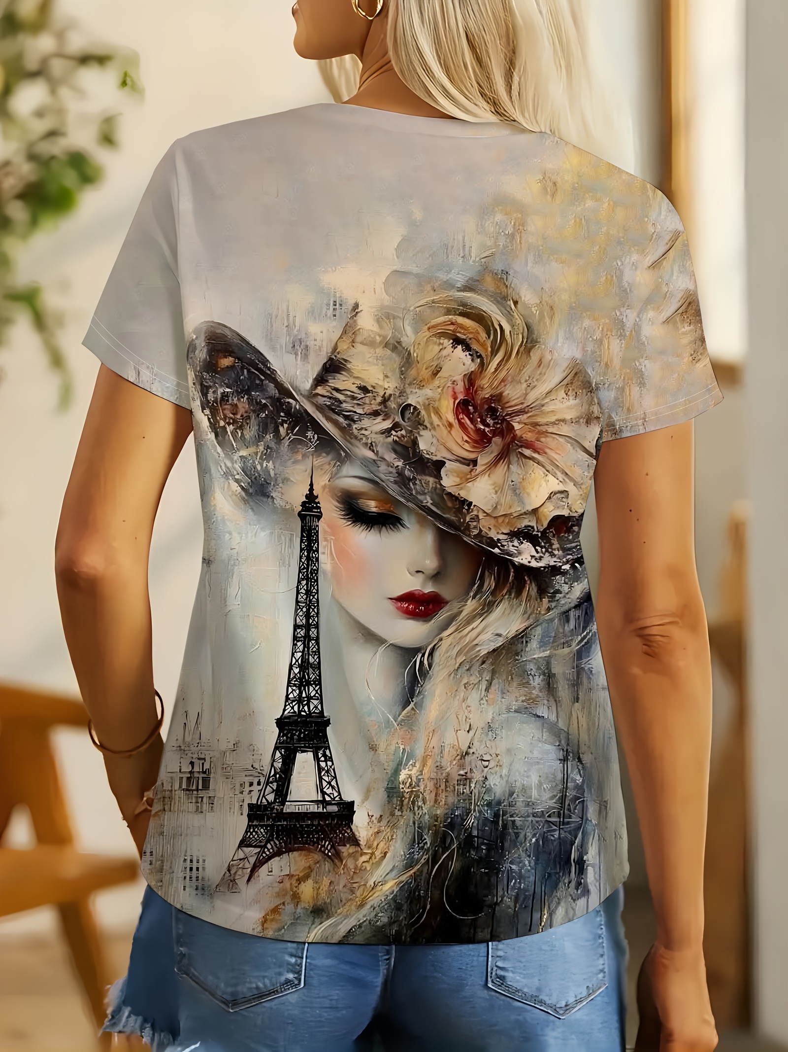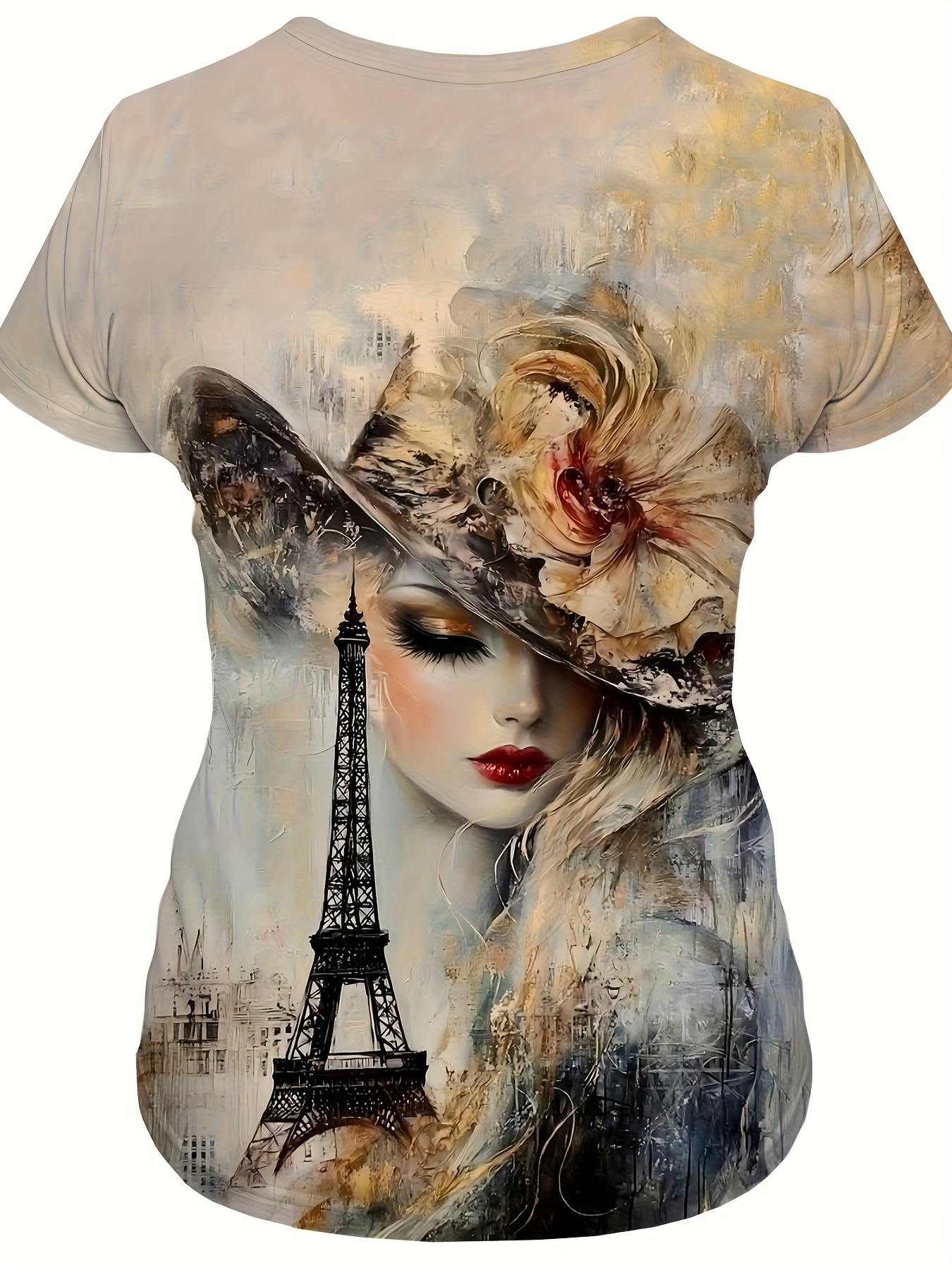 Women's French Art Style T-Shirt - Oil Painting & Eiffel Tower Print, Casual Short Sleeve Round Neck Top, Machine Washable All-Season Women's Clothing