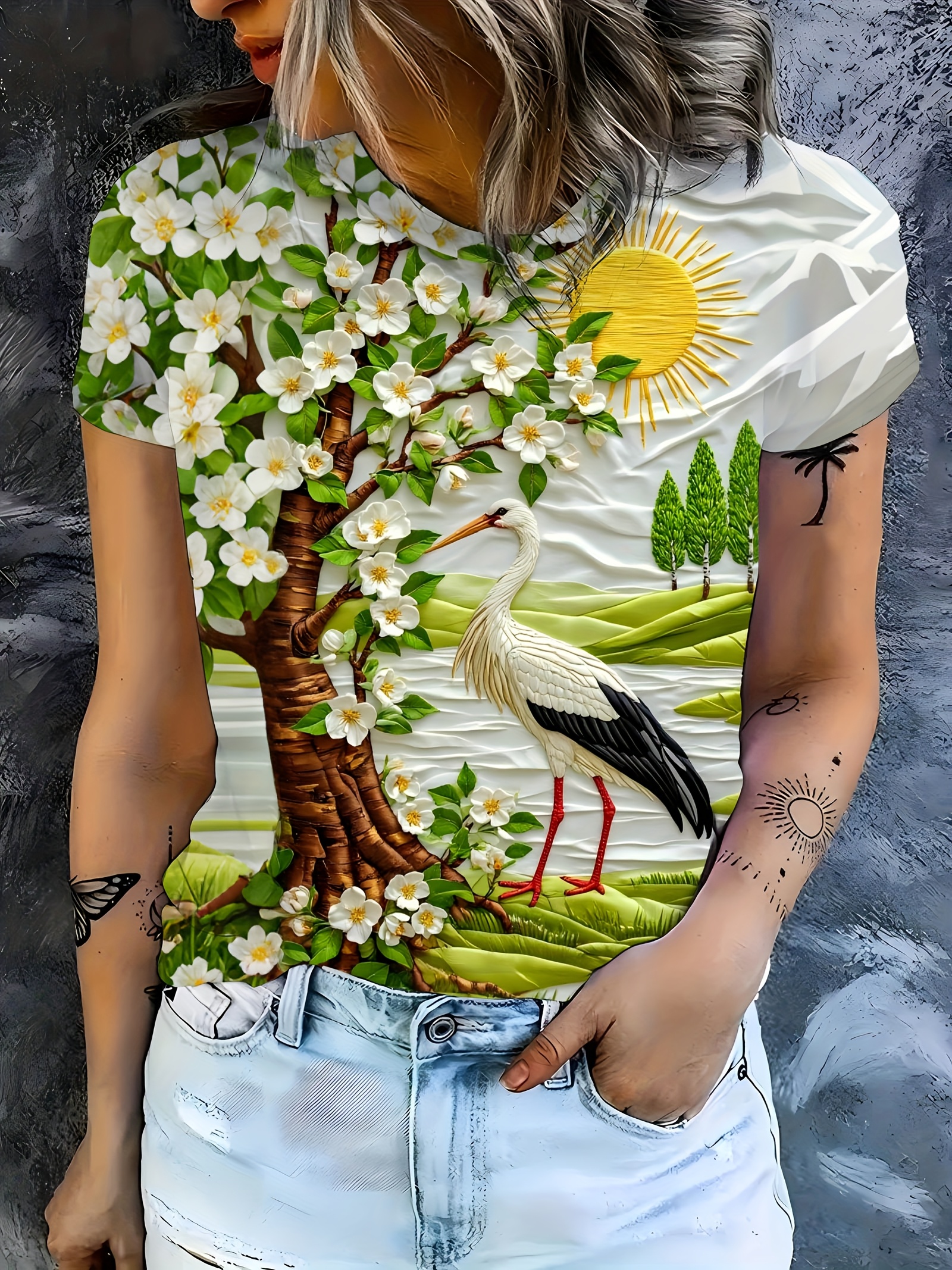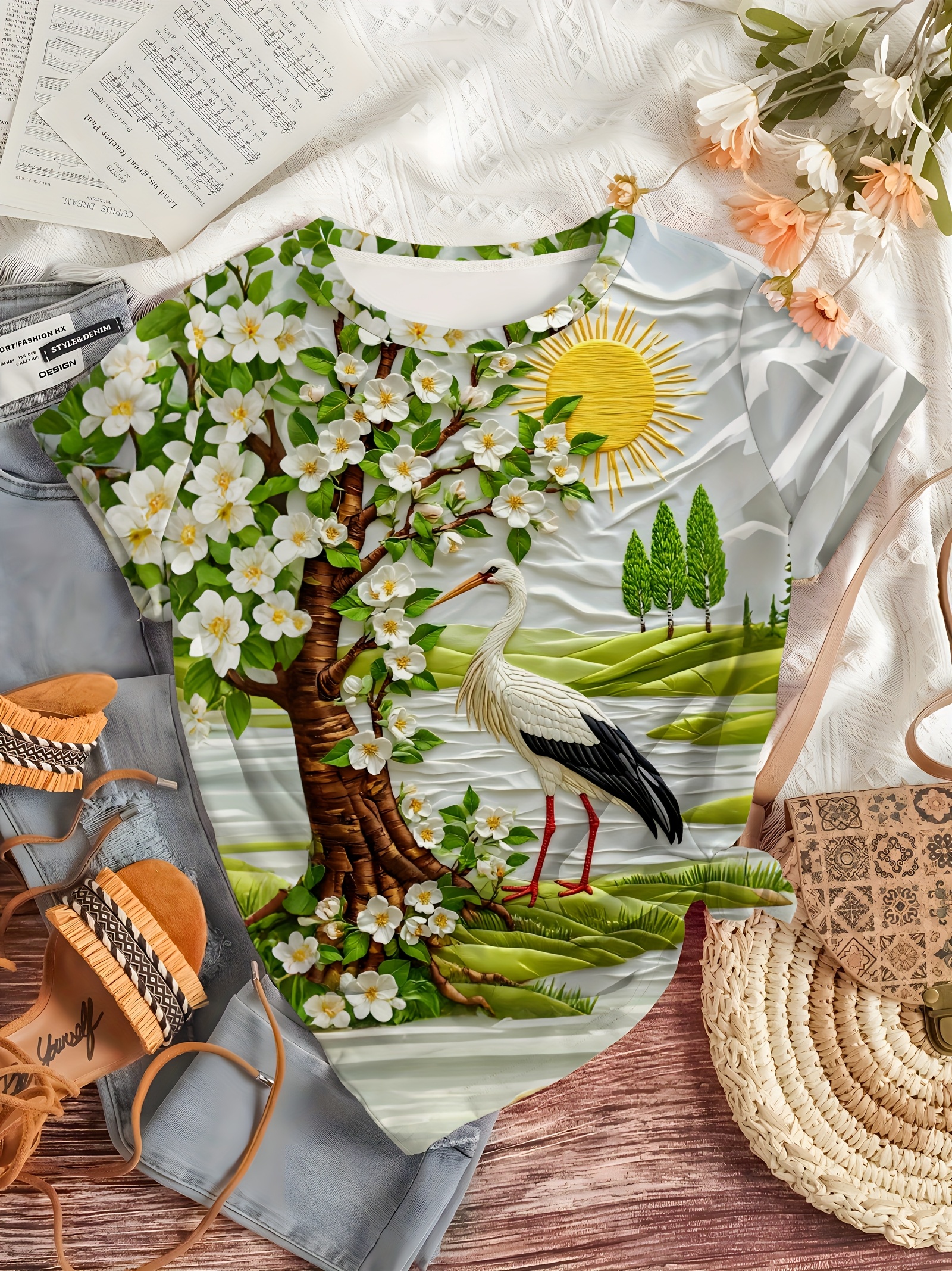 Women'S Elegant White Flower & Bird Print T-Shirt - Fresh Countryside Landscape Design, Comfortable Round Neck, Short Sleeve, Lightweight Polyester Blend for Casual Outdoor Wear, Ladies T