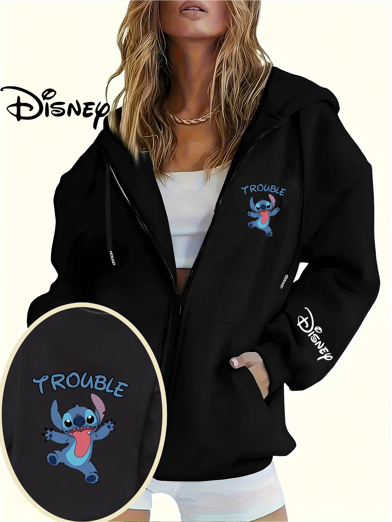 Disney Stitch TROUBLE Women'S Casual Zip-Up Hoodie - Front Zipper Design, Pink Cartoon Print, Cozy Fall/Winter Jacket with Hood, Cute Hoodies