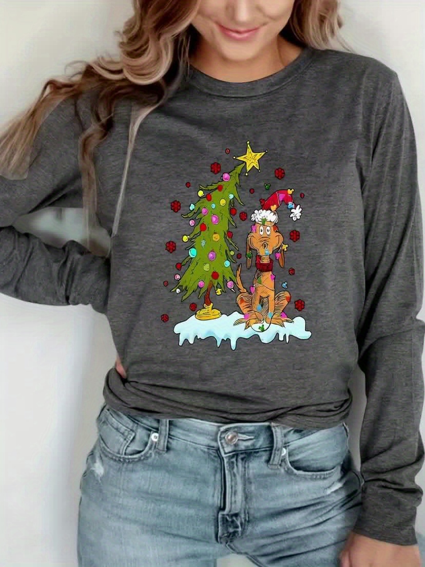 Women'S Christmas Puppy & Tree Graphic Long Sleeve T-Shirt - Soft Breathable Fabric, Stretchy Comfort Fit, Round Neck Casual Holiday Top for All Seasons, Sizes S-XXL, Christmas Shirts, Allseason Apparel, Playful Design, Durable Print