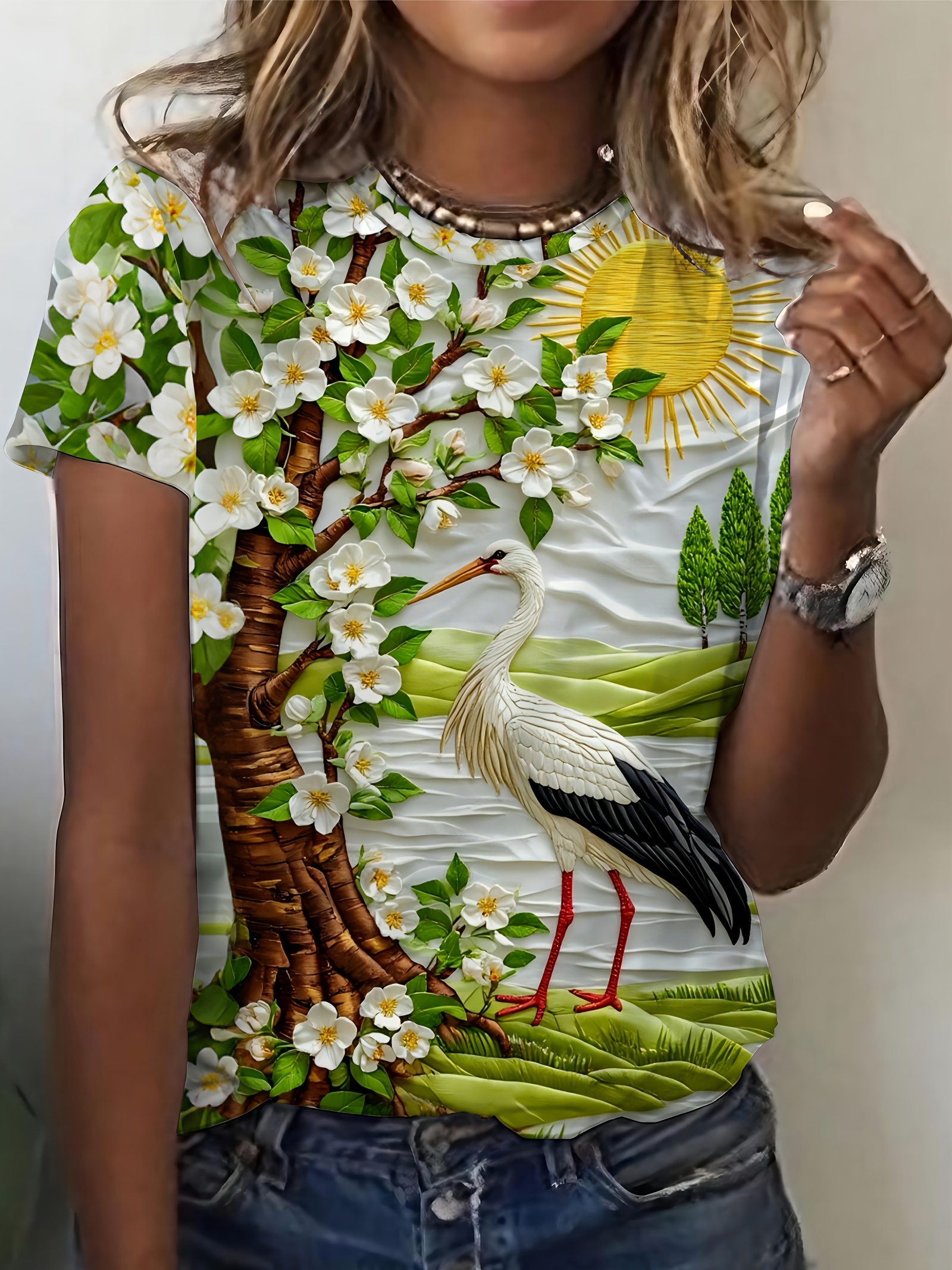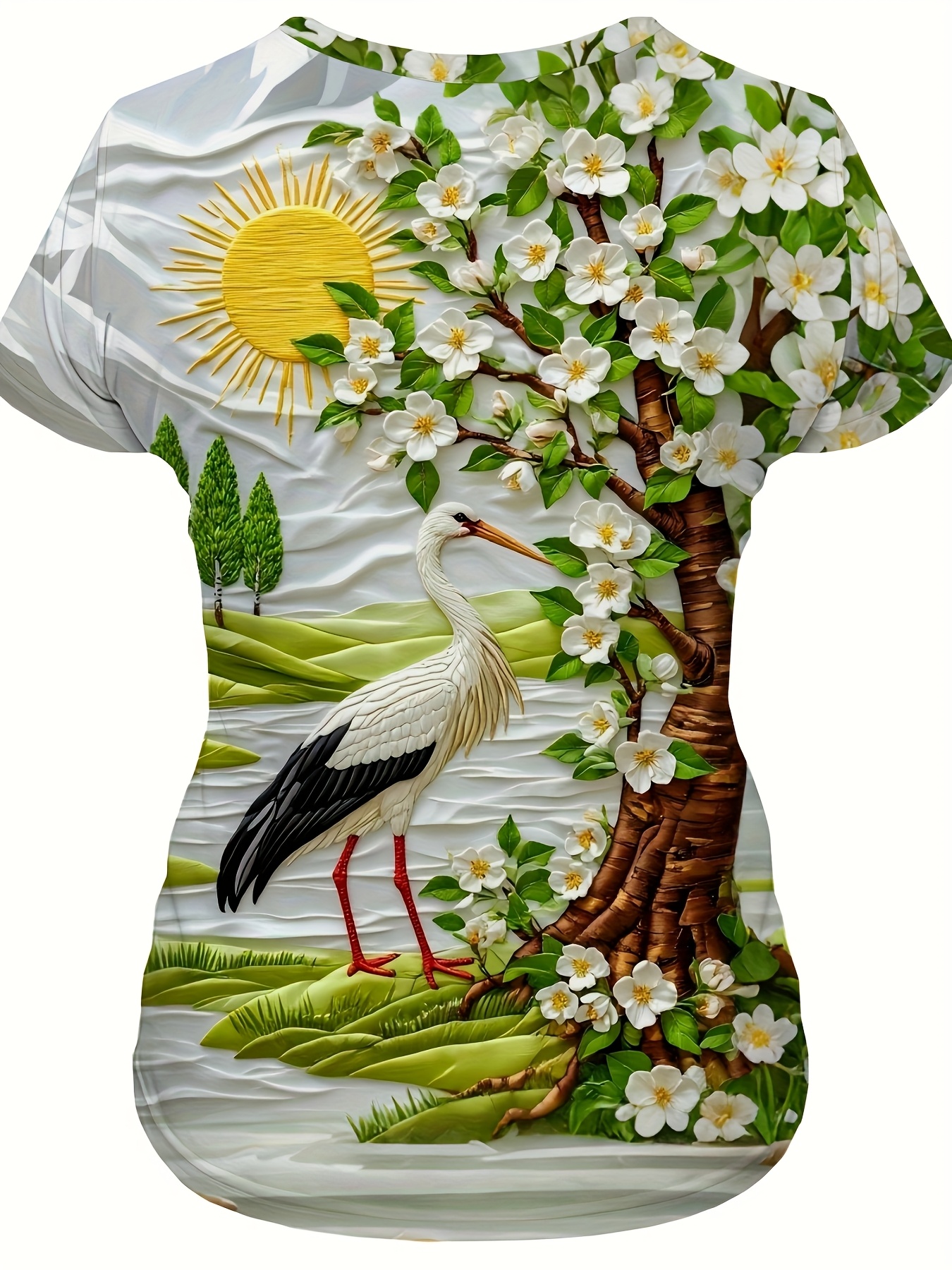 Women'S Elegant White Flower & Bird Print T-Shirt - Fresh Countryside Landscape Design, Comfortable Round Neck, Short Sleeve, Lightweight Polyester Blend for Casual Outdoor Wear, Ladies T