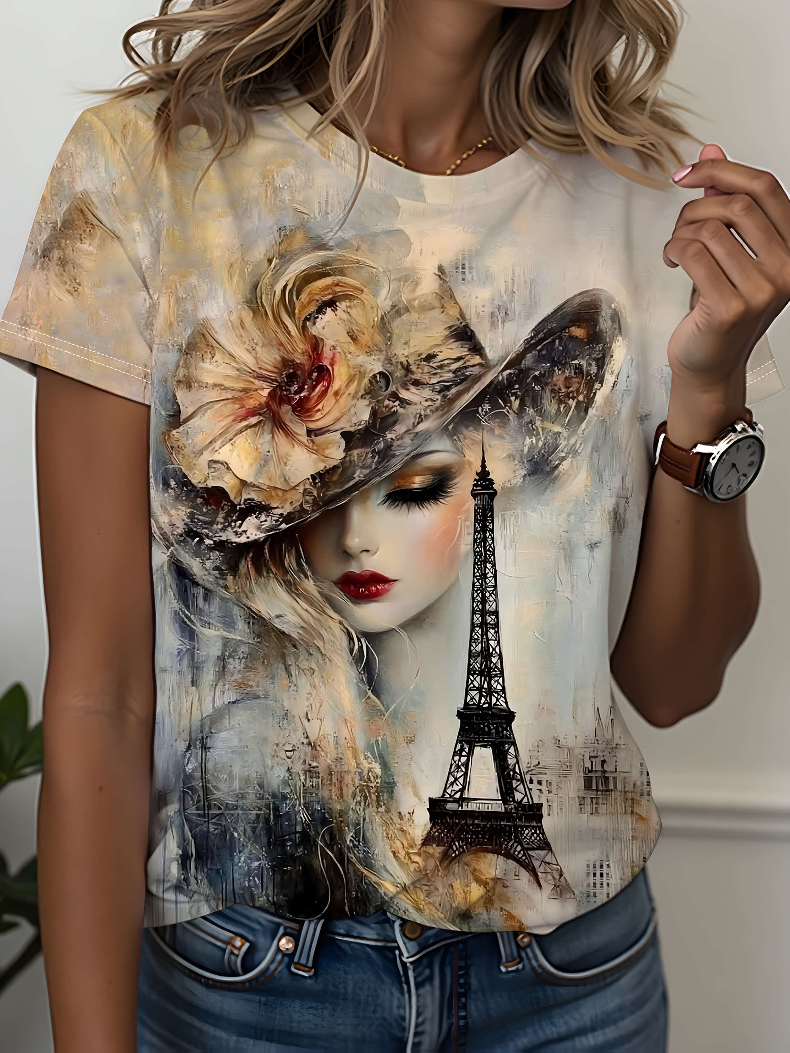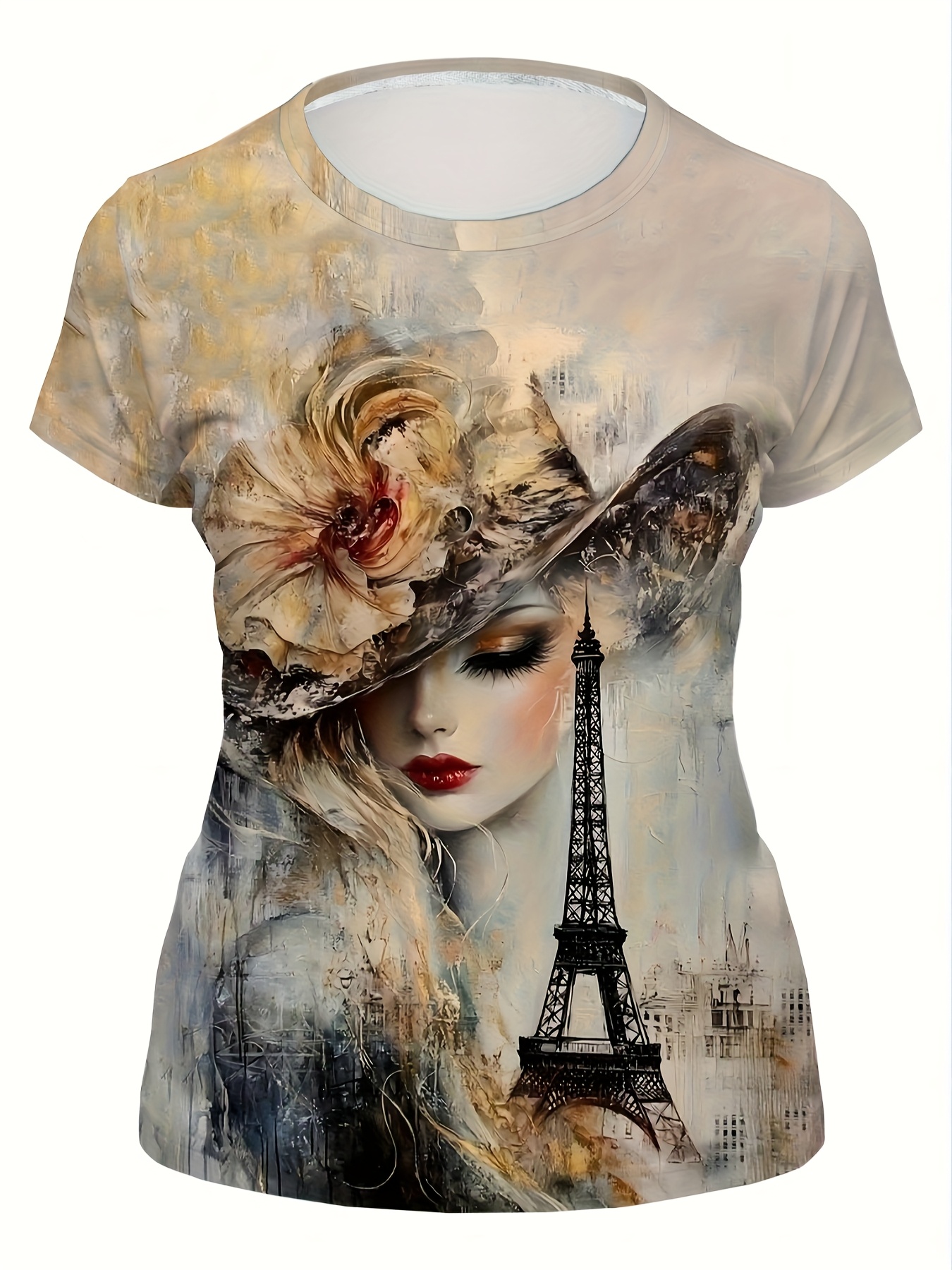Women's French Art Style T-Shirt - Oil Painting & Eiffel Tower Print, Casual Short Sleeve Round Neck Top, Machine Washable All-Season Women's Clothing