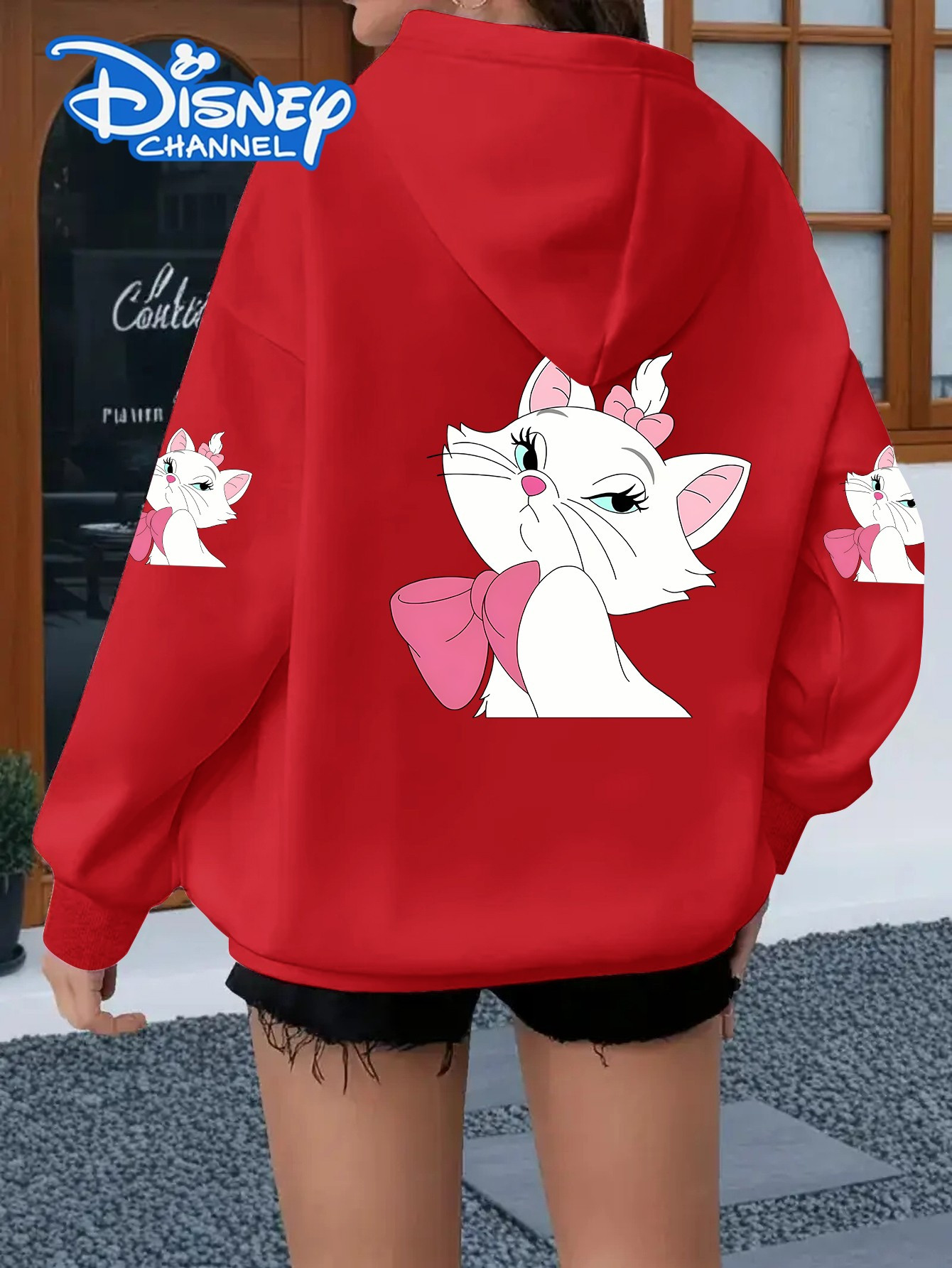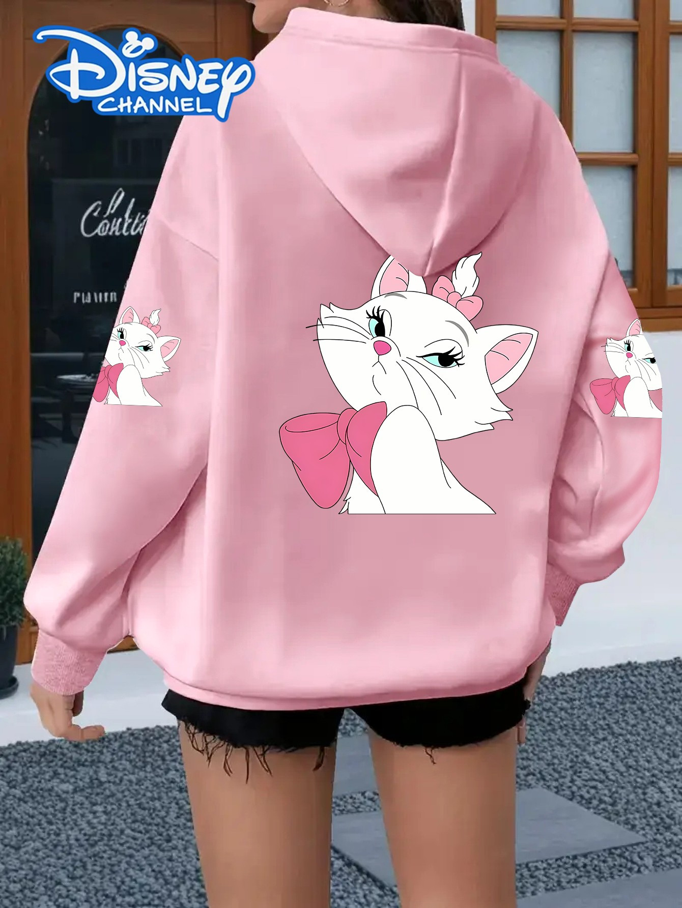 Women's Plus Size Hooded Zipper Jacket - 3-Panel Cartoon Cat Print with Pink Bows, 100% Polyester Machine-Washable Spring/Fall Casual Outerwear, Gift for Fans, Fall Fashion, Playful Design, Comfortable Fit, Cozy Outerwear, Fashion Lovers