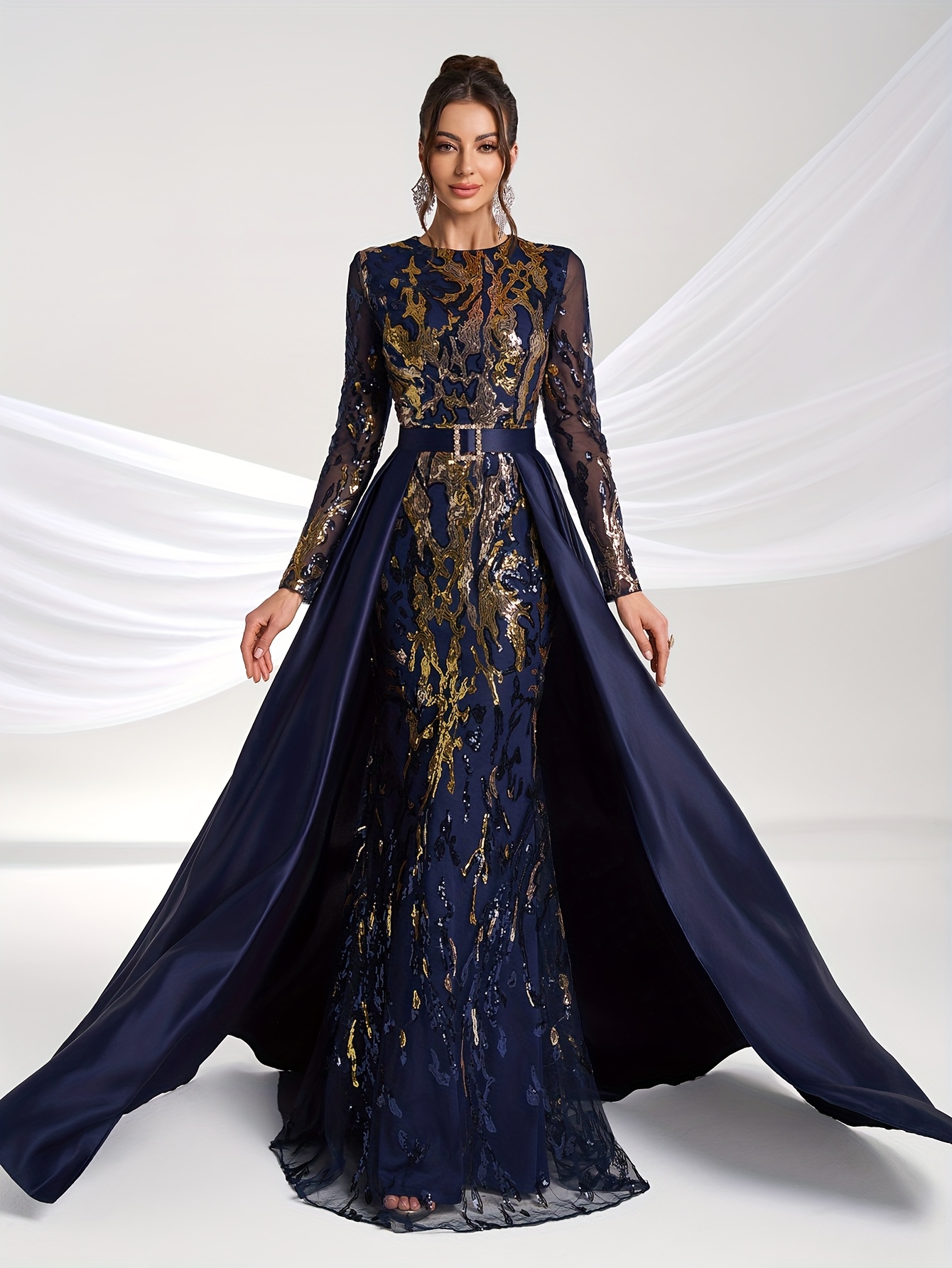 Elegant Women'S Formal Banquet Dress with Sequin Detail - Long Sleeve, Round Neck, Detachable Cape, Navy Blue/Golden Floral Print, Polyester, Perfect for Weddings and Special Occasions